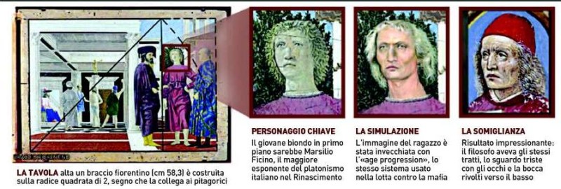 La Polizia tramite l’ausilio di tecniche investigative, in particolare della comparazione antropometrica, ha confrontato una riproduzione del giovane biondo ritratto nella Flagellazione con delle miniature raffiguranti Marsilio Ficino.