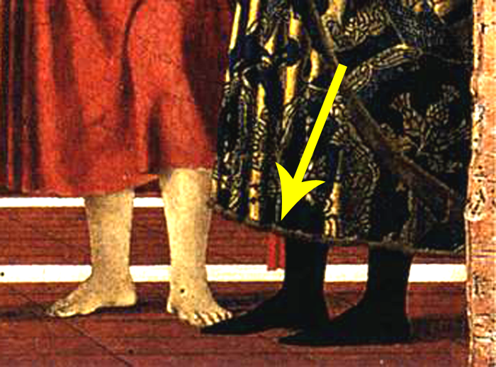 Ho dubbi anche sulla realizzazione del dipinto dell’abito del Sassetti, evidentemente ricco e di fattura pittorica che non ha niente a che vedere con le realizzazioni degli altri abiti e tessuti della stessa tavola.