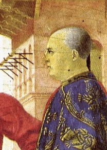 Il Sassetti ritratto dal Ghirlandaio nell’omonima cappella è più anziano rispetto a quello ritratto nella flagellazione di Piero della Francesca ma secondo me è comunque ben riconoscibile nei tratti del viso, nella particolare capigliatura rasata corta e probabilmente nel neo sotto la mandibola sinistra.